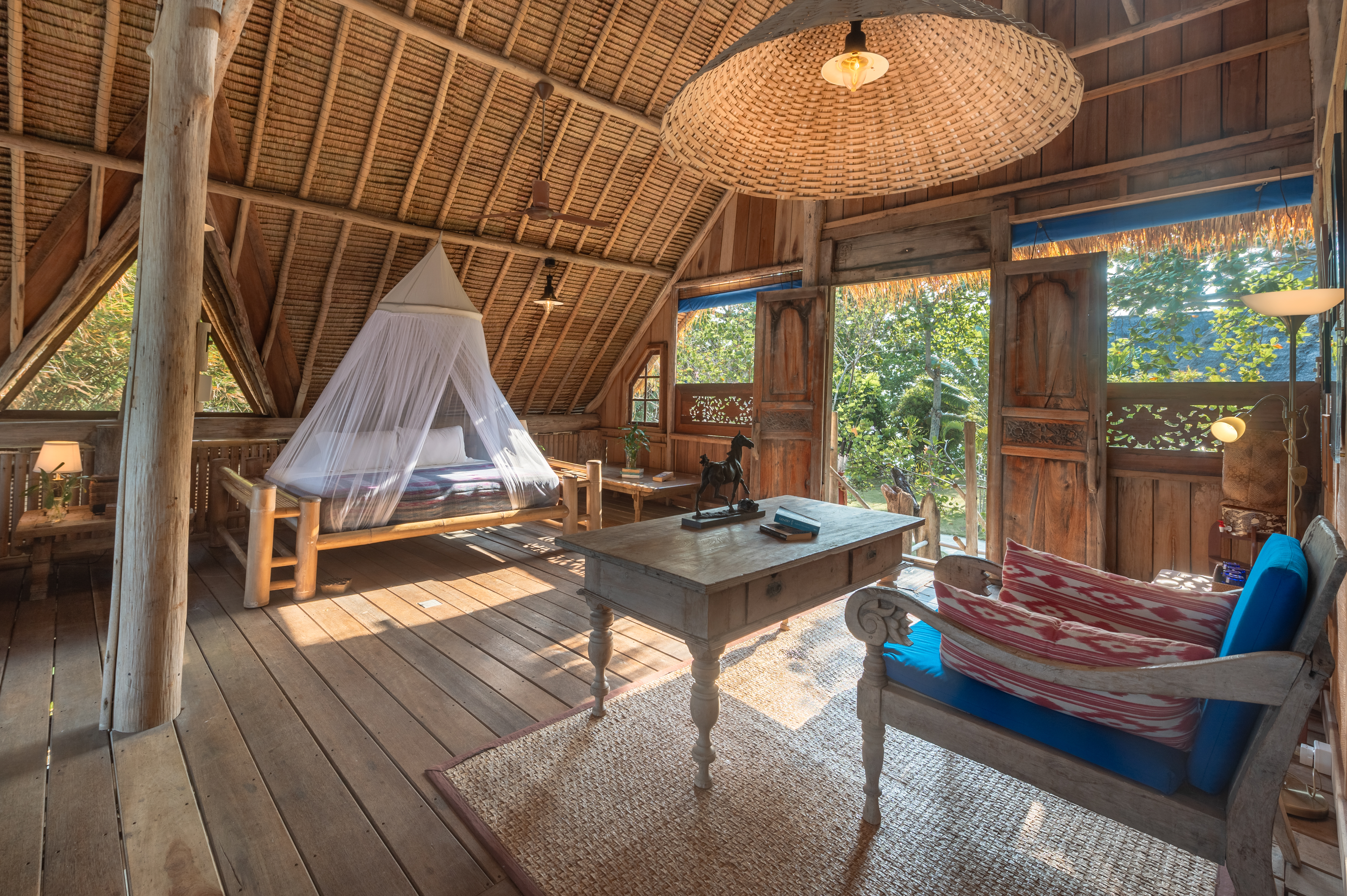 This Big House is our giant Driftwood Palace with a big double bed and two double Balinese beds. It has an en-suite bathroom and capacity for additional beds.